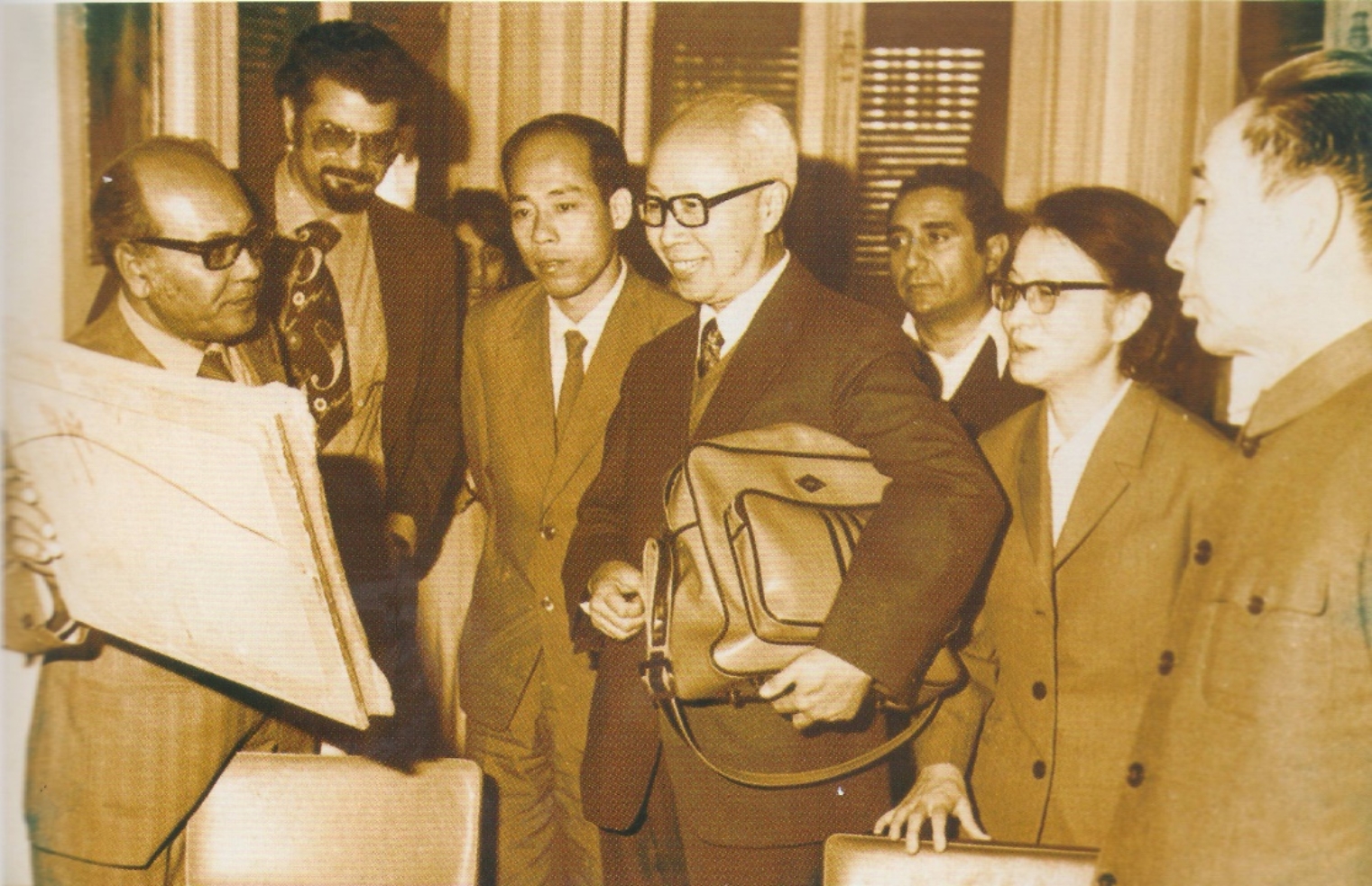 1981年访问埃及时,埃及哈莱旺大学副校长向中国代表团介绍学生美术作品。